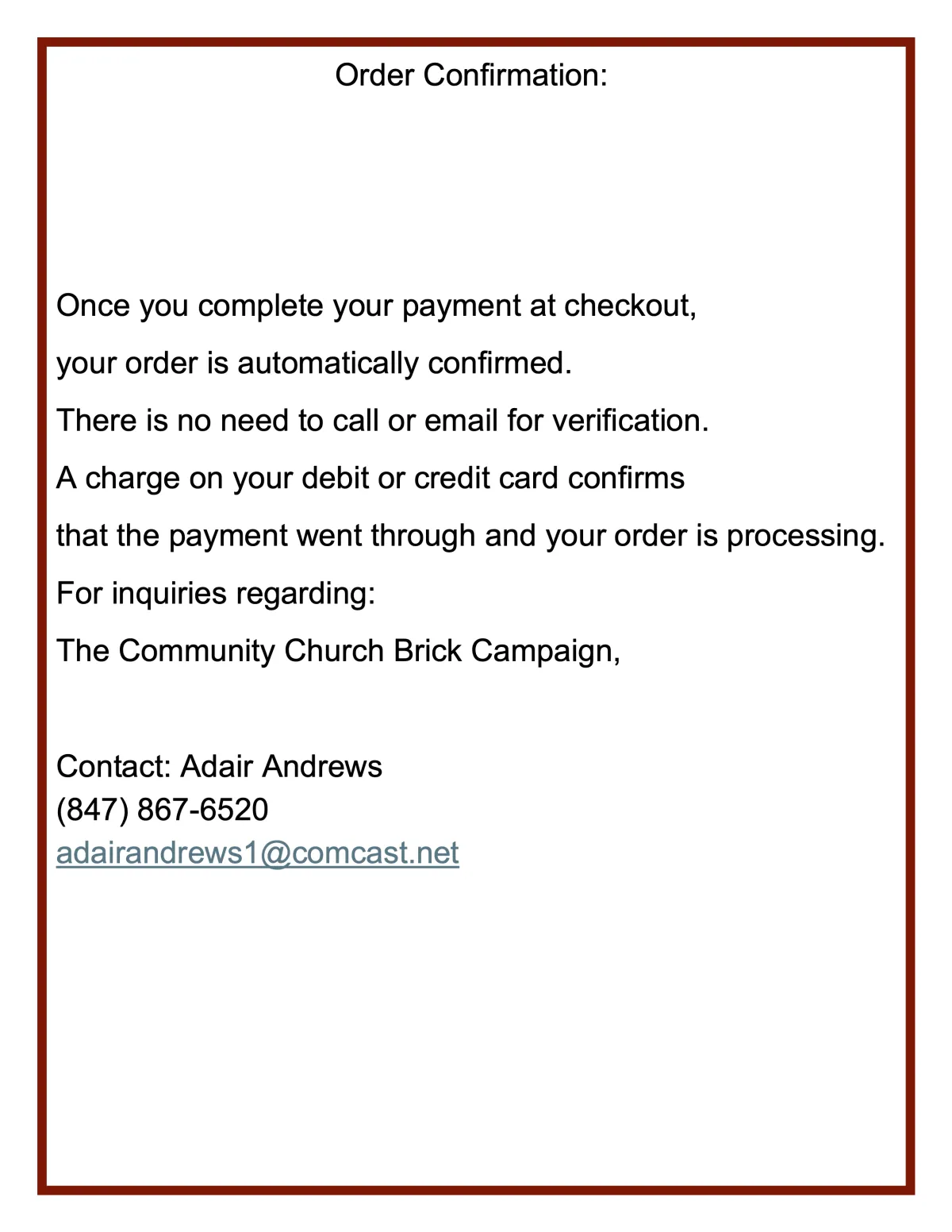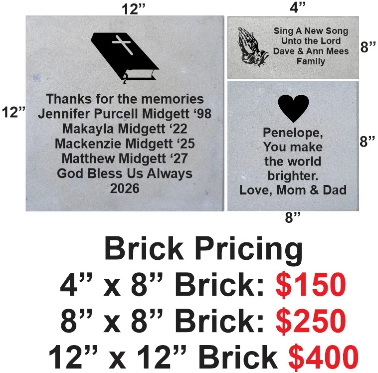 We invite you to help build our new community church by purchasing a commemorative brick. Become a permanent part of this blessing by leaving a mark, a memory, or a story that will endure for generations to come. Thank you for your support, and God bless you